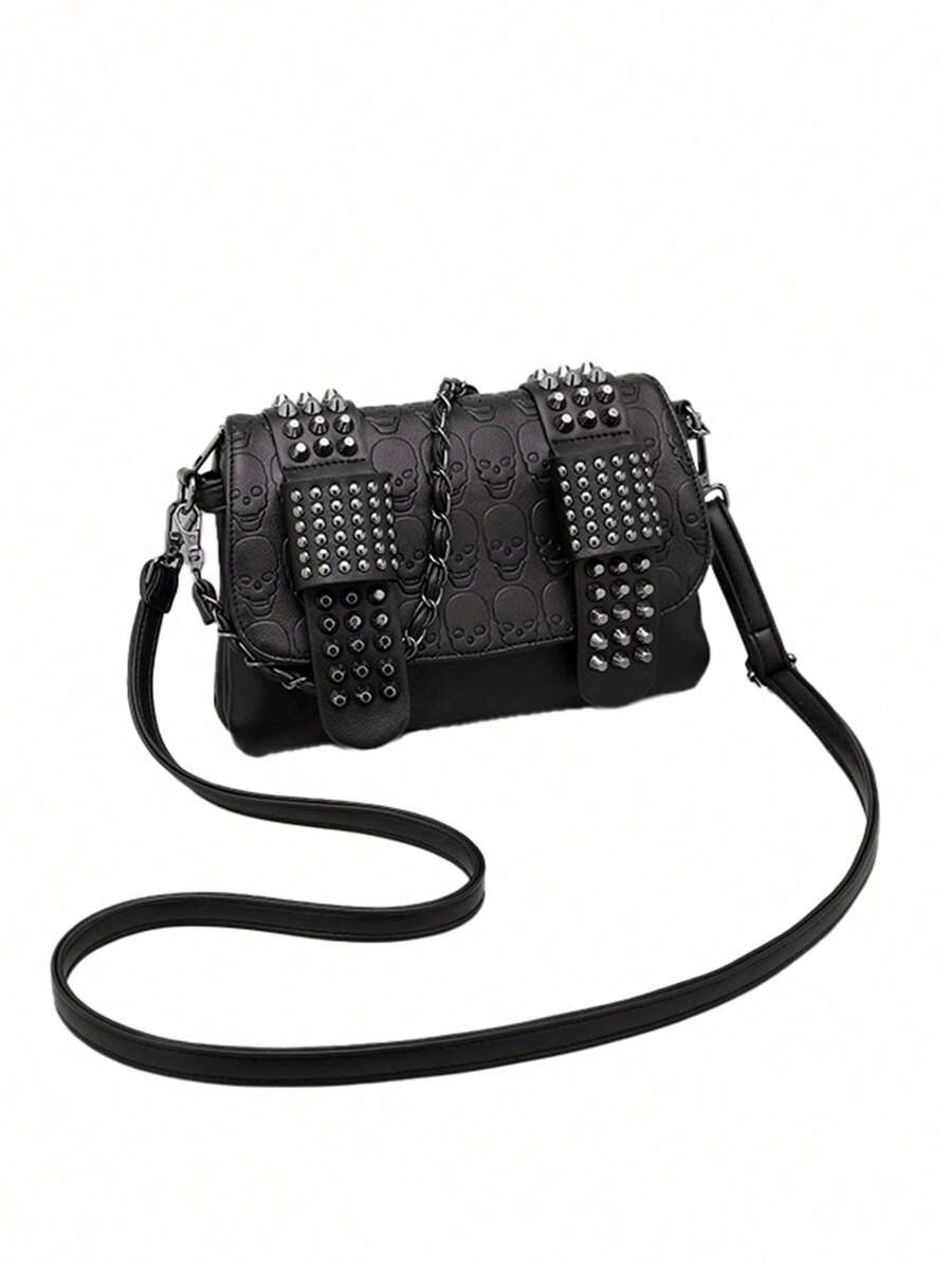 (Halloween) New Fashion Solid Color Multi-Compartment Shoulder Bag, Versatile High-End Skull Embossed Design, Unique Rivet Decor Detachable Adjustable Magnetic Flap Crossbody Bag, Suitable For Outing, Dating, Shopping, Commuting/Work, Office Daily Matching, Gift Giving.