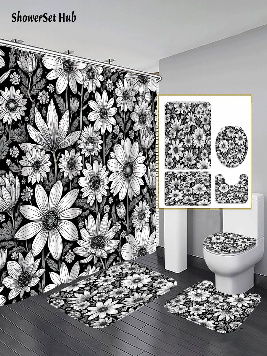 1/3/4pcs Black & White Daisy Floral Print Shower Curtain Bathroom Sets,Minimalist Retro Style Waterproof And Wear-Resistant Accessories,With 12 Hooks - Includes Toilet Seat Cover, Bath Mats, And Rugs - Plastic Fabric - Washable,Mildew-Resistant - Perfect For Holiday Decor,Home/Bedroom/House/Western/Spring Decor,