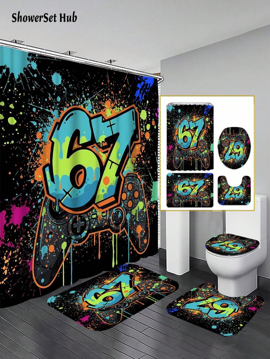 1/3/4pcs Gaming Controller Graffiti Number 67 Shower Curtain Bathroom Sets,Cool Gamer Waterproof And Wear-Resistant Accessories,With 12 Hooks - Includes Toilet Seat Cover, Bath Mats, And Rugs - Plastic Fabric - Washable,Mildew-Resistant - Perfect For Holiday Decor,Home/Bedroom/House/Western/Spring Decor,