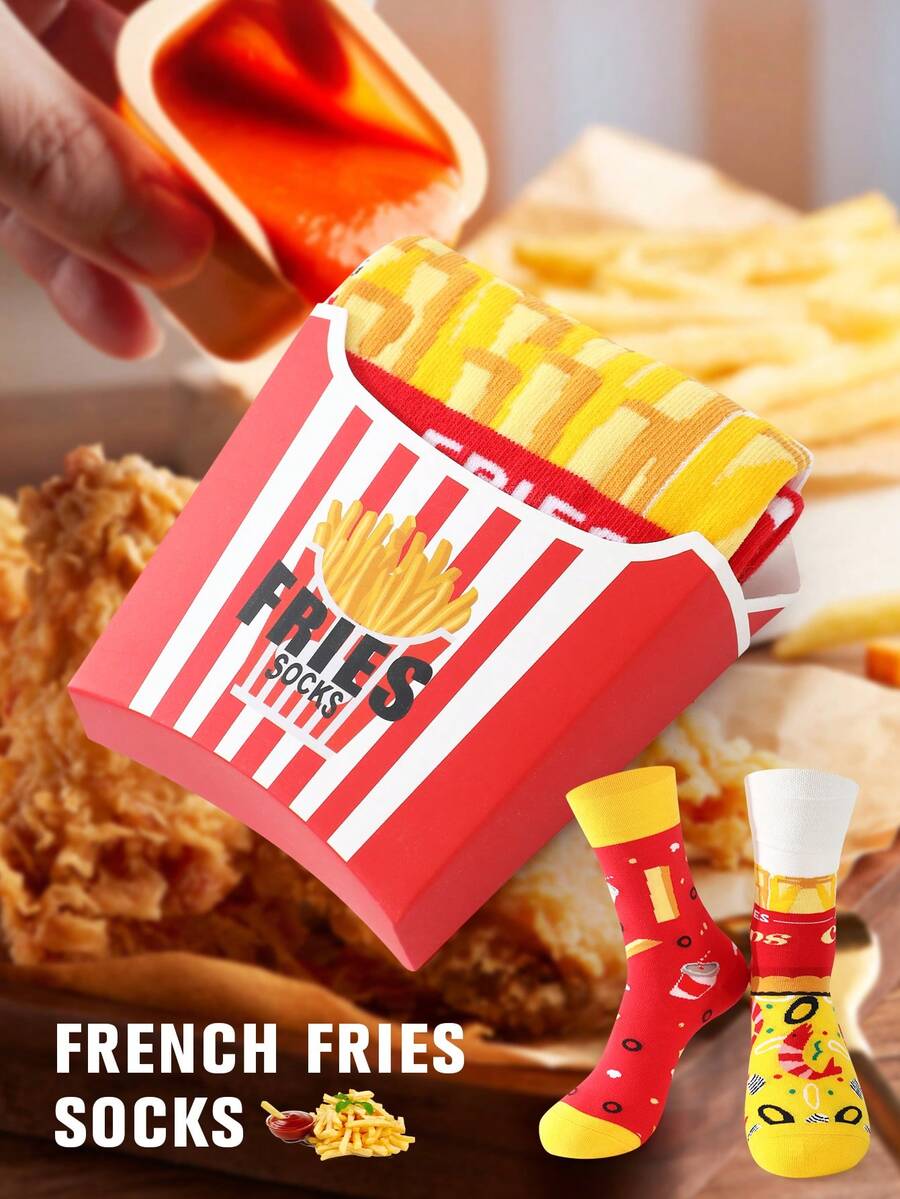 1 Pair Novelty French Fry Box Design Crew Socks, 2025 Autumn/Winter New Unisex Long Socks, Creative Food Inspired Design, Soft & Comfortable, Perfect Gift For Back To School, Birthday, Thanksgiving, Halloween, Christmas, Carnival, Valentine's Day, Family Gathering, Party, Fashionable & Casual Everyday Wear, Fall