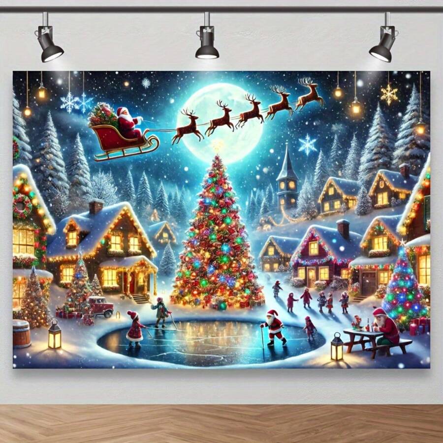 2D Charming Christmas Village Photography Backdrop With Santa Claus, Trees And Holiday Decorations - Perfect For Studio Shooting, Christmas Events And Winter Celebrations