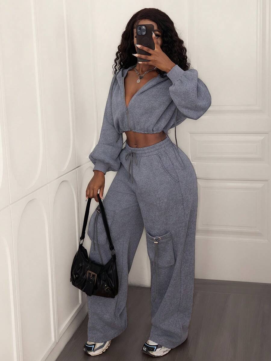 2pcs/1set Women Casual Solid Color Oversize Plain Cropped Hoodie And Sweatpants Set, Autumn/Winter Fall Cloth For Women,Gray Two Pieces Set,Women Comfortable Two Pieces Set