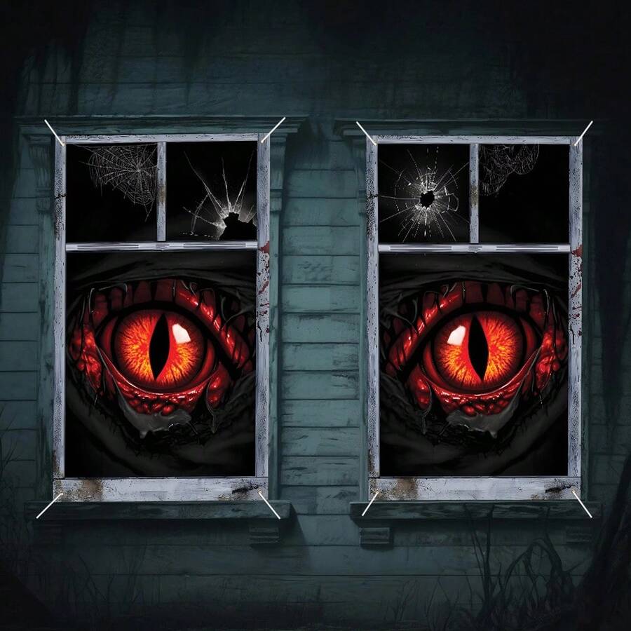 2pcs Halloween Window Banner 47.2x31.5 Inch Polyester, Horror Grunge Window With Glowing Red Eyes Design, Halloween Scary Theme Window Screen Decor For Indoor Outdoor Party