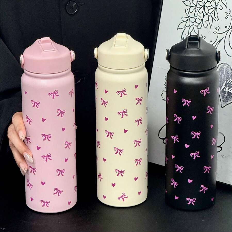 800ml Pink Insulated Water Bottle With Cute Bow And Heart Print - 304 Stainless Steel Coffee Cup With Portable Handle And Foldable Straw, Perfect Gift For Women, Sisters, And Girlfriends For Valentine's Day, Christmas, Back To School And New Year