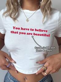 Customized T-Shirt, Customized Text, Casual Spring/Summer Women's T-Shirt, Holiday Gift, Spring/Summer Clothing, Best Friend Gift, Mother's Day, Father's Day, Anniversary, Valentine's Day, Christmas, Thanksgiving, New Year Customize Women's Short Sleeve Cropped T-Shirts, Add Your Text, Choose Your Favorite Colors And Fonts, Design Your Own Personalized Printed Short Sleeve T-Shirts, Anniversary Gifts, Valentine's Day,Stylish,Fashion,Hipster,Casual,Minimal Chic,Personalized,Customized,Custom,Unique,Guy Costumes,Capsule Wardrobe,Men Basic/Street Style,Ideal Gifts For Him,Boyfriend,Family,Friends,For Birthdays,For Vacation/Holiday,For School/Competition,For Sports/Climbing,Chic Autumn,T-Shirt With A Custom Printed Slogan
