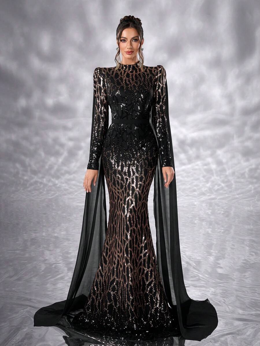 Elisanya Women Formal Banquet Dress Elegant Luxury Gradient High Neck Sequin Contrast Chiffon Glittery Dress Long Sleeve Birthday Party Wedding Guest Graduation Dinner Ceremony Celebration Ceremonial Dress