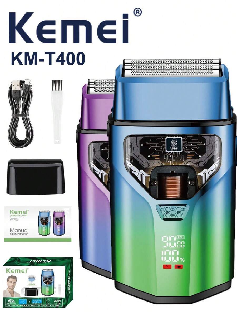 Kemei KM-T400 Men's Electric Shaver, Dual Blade Reciprocating Electric Shaver, Wet & Dry Use, IPX7 Waterproof, LED Display Rotary Shaver, With Beard Trimmer, USB Type-C Rechargeable Wireless Design