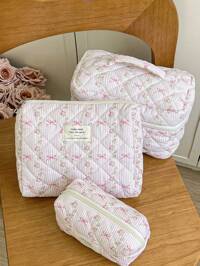 1pc Pink Bow Floral Striped Quilted Cosmetic Bag, Large Capacity Portable Makeup Bag With Zipper, Suitable For Travel And Vacation, Can Store Sanitary Napkins, Keys, Phones, Chargers, Lipsticks, Cosmetics, Perfumes, Makeup Brushes, Ideal Storage Bag For Skincare And Beauty Products, Suitable For Women, Students, Female Friends, Great Gift For Christmas, Holidays, New Year