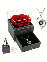 1pc Romantic "I Love You" Projection Gem Necklace, Rose Flower Gift Box Packaging, Containing Preserved Flower, Single Necklace Pendant Placed In Drawer-Style Gift Box, Can Project "I Love You" In 100 Languages, Suitable As Holiday Gift