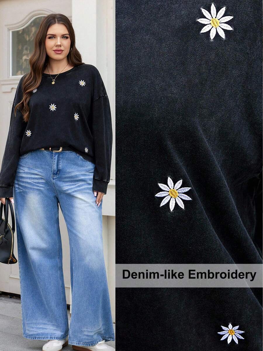SHEIN LUNE Plus Size Casual Floral Embroidery Round Neck Drop Shoulder Sweatshirt, Autumn/Winter Plus Size Casual Long Sleeve Embroidered Snowflake Washed Loose Fit Crew Neck Pullover Sweatshirt,Fall Clothes For Women Winter Autumn Women Long Sleeve Tops Winter Tops For Women Plus Size Sweatshirts Tops For Women Plus Full Sleeve Tops,Black Top,Winter Clothes For Women,Christmas Outfit For Women,Christmas Jumper,Christmas Women's Clothing,New Year Outfit,Clothes For New Year,Thanksgiving Outfit For Women,Casual Daily Wear,Everyday Commute & Outdoor Essential,Commute,Minimalist,Simple Women Tops,Office Siren Style Outfits