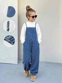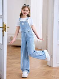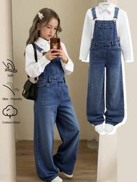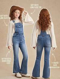 JambiniTween Girls Denim Overalls & Jumpsuits, 2025 Autumn/Winter New Arrival, Fashionable Retro Washed Vintage Blue Flared High Waist Skinny Stretch Denim Bib Pants And Jumpsuit, Retro Y2K College Style, Casual Street Wear, Soft And Comfortable Cotton Denim For Daily Wear, School, Commute, Party, Home, Back To School Season, Holiday