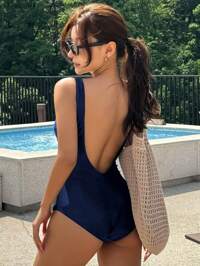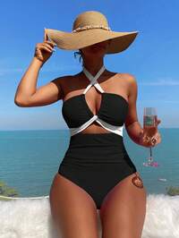 ONTREOntre 2025 New Women's Beach Outfit, Independence Day, Comfortable Casual Style, Fitted Silhouette, Ladies One-Piece Swimsuit, Navy Blue With Apricot Contrast, Halter Neck Design, Boyleg Shorts, Spring/Summer Beachwear, Comfortable Casual Swimwear, Suitable For Swimming #1 Bestseller