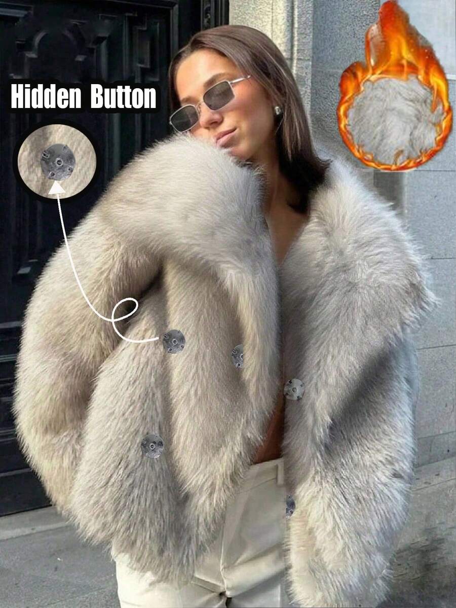 Women's Elegant Commuting And Street-Going College Simple Fashion Casual Versatile, Large Lapel Long Sleeve Gray Fine Fleece With Hidden Buttons Fake Fur Coat, Suitable For Halloween, Christmas Eve, Christmas, Spring Festival, Outings, Girlfriends Gatherings, Home Shopping, Entertainment, Going Out To Work, Etc. The Basic Coat Fabric Is Comfortable, The Style Is Distinctive, And The Cost Performance Is High, Suitable For Autumn And Winter Wear