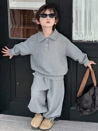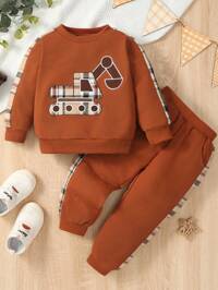 PipplinSHEIN 2pcs Kids Boys Casual Collegiate Comfortable Knit Sleeve Patchwork Crew Neck Sweatshirt And Pants Set, Suitable For Commuting, School, Daily Casual, Collegiate, Suitable For Birthday Party, Evening Party, Wedding, Baptism, School Opening Ceremony, Daily Wear, Travel, Sports, Autumn/Winter, Fleece, Thickened Fall