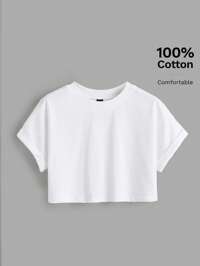 SHEIN BASICS Round Neck Casual Drop Shoulder Solid Crop Tee
