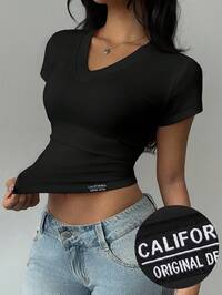 SHEIN BASICS Casual Minimalist College Style California Letter Badge Decor V-Neck Ruched T-Shirt, Suitable For Summer, Back To School Season, College Style, Old Money Style Homecoming,Black Tops