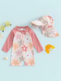 2Pcs Baby Girl Bathing Suit Set Sea Shell Print Long Sleeve Rash Guard Swimsuit Wide Brim Sun Hat Beachwear