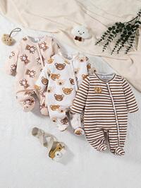 3pcs Baby Boy Cute Cartoon Bear Allover Print Allover Print Footie Jumpsuit Set