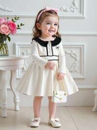 SHEIN Baby Girls' Sporty Chic Elegant Casual Dress, Black Contrast Polo Collar Bow Embroidery Decor Long Sleeve Beige Dress, Suitable For School, Vacation, Photoshoot, Spring/Summer/Autumn/Winter, New Arrival Fall