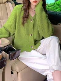 EMERY ROSE Loose Button Decor Round Neck Comfy Solid Color Cardigan Fall Winter Cloth For Women, Christmas