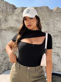 SHEIN EZwear Plus Size Hollow Out Short Sleeve Black Knit T-Shirt