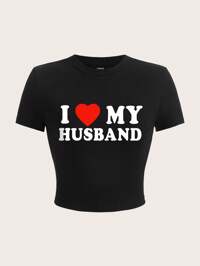 SHEIN EZwear Casual Minimalist Letter And Heart Pattern Crew Neck Short Sleeve Cropped Fitted Women T-Shirt, Suitable For Summer, Valentine's Day Suitable For Going Out