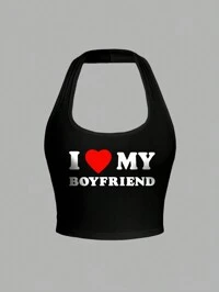 SHEIN EZwear Casual Heart "I Love My Boyfriend" Print Racerback Tank Top For Women, Summer Back To School
