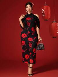 Elenzga New Plus Size Women's Elegant Chinese-Style Cheongsam Dress For Valentine's Day, Romantic Mesh Floral Print, Elegant And Sexy, Showcasing Good Figure, Suitable For Chinese New Year Atmosphere, Romantic Date, Unique Party Outfit, Showcasing Urban Feminine Charm