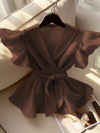 Elegant V-Neck Solid Color Ruffle Sleeve Tie Waist Shirt With Sash