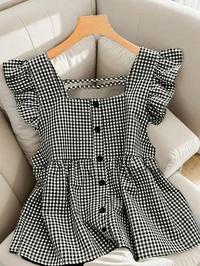 2025 Spring & Summer Fashion Daily Casual Commuter Cute Style Single-Breasted Ruffle Plaid Women Blouse, Suitable For Everyday Wear, Christmas, New Year