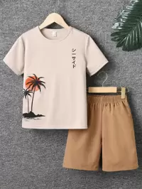SHEIN Tween Boy Japanese Letter & Palm Tree Print Tee & Shorts