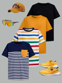 Buy 3 Get 1 Free, 4pcs/Set Tween Boys Comfortable, Versatile, Casual Striped Round Neck Short Sleeve T-Shirt With Pocket, Suitable For Daily Wear, Sports, Outings, School, Gatherings, Festivals, Photoshoots, Back To School Season, Spring/Summer