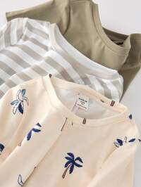3pcs/Set Kids Boys Casual Everyday Vacation Versatile Comfortable Solid, Striped, & Coconut Tree Print Crew Neck Loose Fit Short Sleeve Knit T-Shirt 3 Assorted Styles, Suitable For School, Garden, Beach, Birthday, Spring, Summer, Fall, Winter
