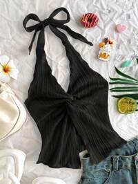 SHEIN Tween Girl Casual Vacation Textured Knit Light Yellow Bow Decor Halter Neck Camisole Black Tie Top Halter Top Black Summer Top Tie Front Top Halter Neck Top Black Halter Top Twisted Front Top