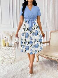 Lyxana Women's Floral Print Overlap V-Neck Short Sleeve Elegant Dress Maxi Women Outfit