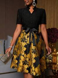 Lyxana Lace Jacquard Fabric Splice V-Neck Belted Wrap Elegant Mid-Length Dress For Women