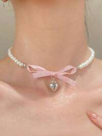 1pc French Pink Heart & Bow Pearl Necklace, Unique Design Sweet & Innocent Choker For Girls