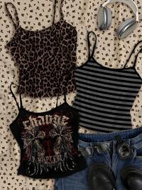 Attitoon 3pcs Women's Casual Vintage Tight Contrast Trim Tank Top Set, Cross & Wing Print, Leopard, Stripes, Summer, Punk, Y2K Grunge, Halter Top, Retro Vintage, Streetwear, School, Hip-Hop, Concert, Gym, Spor Spring