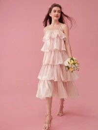 Enchnt Women's Fashionable Pink Ruffle Design Spaghetti Strap Dress