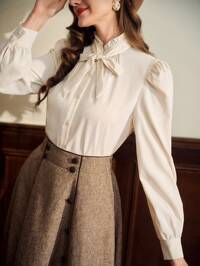 Vintamour Plus Size Vintage Elegant Tie Collar Blouse For Commuting Contrast Trim Bowknot Button Up Casual Blouse Work Vacation Autumn Fall Winter Elegant Blouses Spring Women Spring Break Spring Going Out Top Elegant Blouses For Ladies Elegant Women's Blouses Summer Holiday Spring Break Going Out Top Elegant Blouses For Ladies