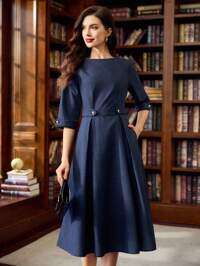 Vintamour Vintage Classic Elegant Women's Dress, Fitted Boat Neck Dress, 3/4 Sleeve Dress, Navy Blue Dress, Metal Button Pocket Dress Summer Spring
