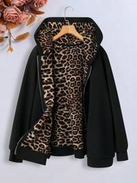 SHEIN LUNE Plus Size Casual Leopard Print Thermal Lined Hoodie For Autumn/Winter Fall