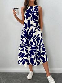 SHEIN LUNE Women Casual Blue & White Printed Mid-Length Dress, Suitable For Spring And Summer Summer Dresses For Women,Sun Dresses For Women,Shirt Dresses For Women Boho Suitable For Going Out Chic Dress