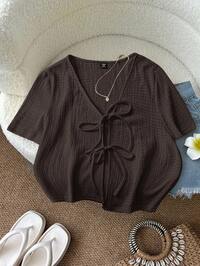 SHEIN LUNE Plus Size Women's Solid Color Front Tie Short Sleeve Casual Top Brown Tie Front Top Tie Front Blouse Dark Brown Top Chocolate Brown Top Brown V-Neck Top Brown Blouses Coffee Brown Top Tie Front Top Plus