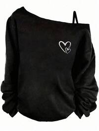SHEIN LUNE Casual Minimalist Style White Double Heart Graphic Dropped Shoulder Long Sleeve T-Shirt For Women, Versatile For Autumn/Winter