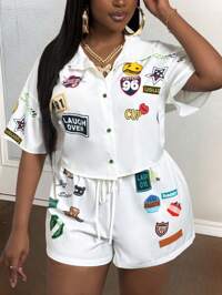 Slaydiva CURVESlaydiva 2025 Autumn & Winter New Arrivals, Women's Fall/Halloween/Winter Clothes, Plus Size Summer Fall Clothes, Music Festival/Halloween Outfits, Easter, Western, Nomadic Style, Birthday Party, Casual Everyday, Vacation, Cruise Travel, Beach, Sunbathing, Viral Hits, Streetwear, Punk, Club, V-Neck Loose Short Sleeve Top, Numeric Print, Yellow, Women Plus Size T-Shirt And Red Shorts, Women Plus Size Lounge Sets