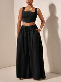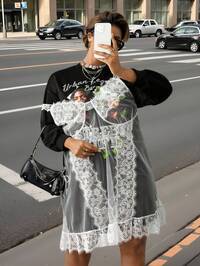 Slaydiva CURVESlaydiva 2025 Autumn/Winter New Arrival, Music Festival, Easter, Birthday Party, Casual Everyday, Vacation, Cruise Travel, Beach, Sunbathing, Fashionable, Black Long Sleeve Solid Color Graphic Print Sweatshirt Dress & Mesh Lace Trim Hollow Out Loose Spaghetti Strap Maxi Dress Plus Size 2-Piece Set Y2k Halloween Thanksgiving
