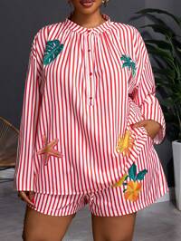 Slaydiva CURVESlaydiva 2025 Summer And Autumn New Casual Street Loose Polo Neck Long Sleeve Green And White Striped T-Shirt + Fitted Mini Shorts Women' Plus Two Pieces Set, Back To School, Graduation Outfit, Daily Travel, Party Gathering, Festival, Vacation, Travel, Brunch Outfit, Concert, Festival Striped Shirt Striped Set Striped Long Sleeve Oversized Shirts Over Sized Shirts Women