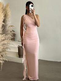 Andrea Bello Women's Solid Color Asymmetric Ruched Backless Maxi Mesh Ruffle Dress, Elegant Beach Vacation Dress, Spring/Summer