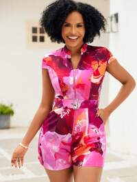 SHEIN Lady Women's Zipper Stand Collar Belt Pocket Jumpsuit With All-Over Print Short Sleeve